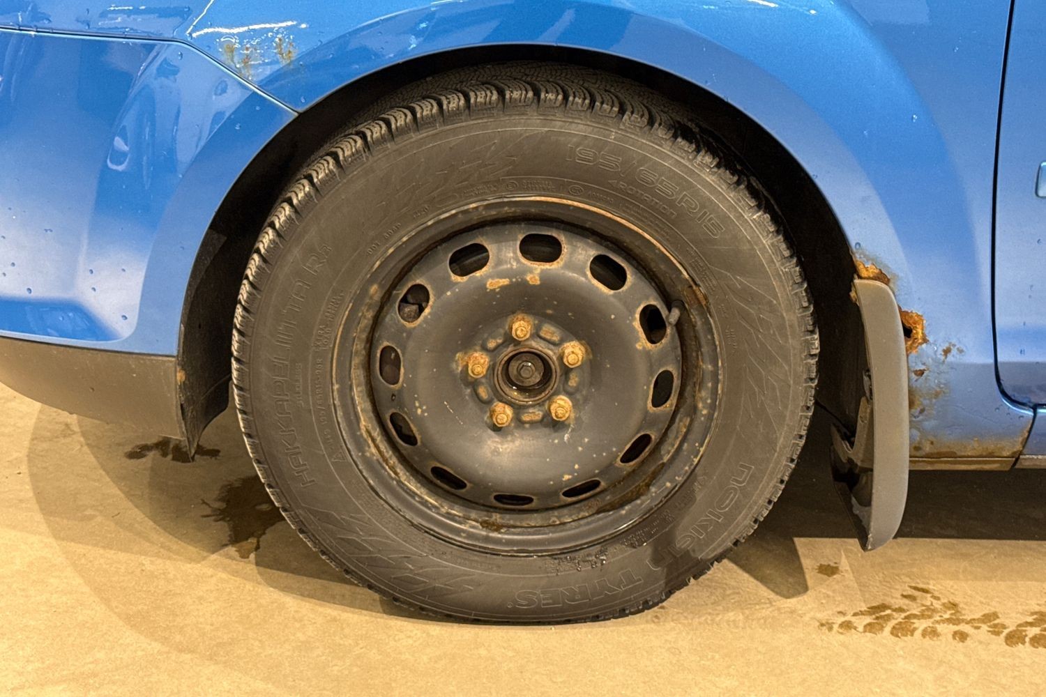 Bilen står på vinterdäck, sommardäck ligger i bilen.